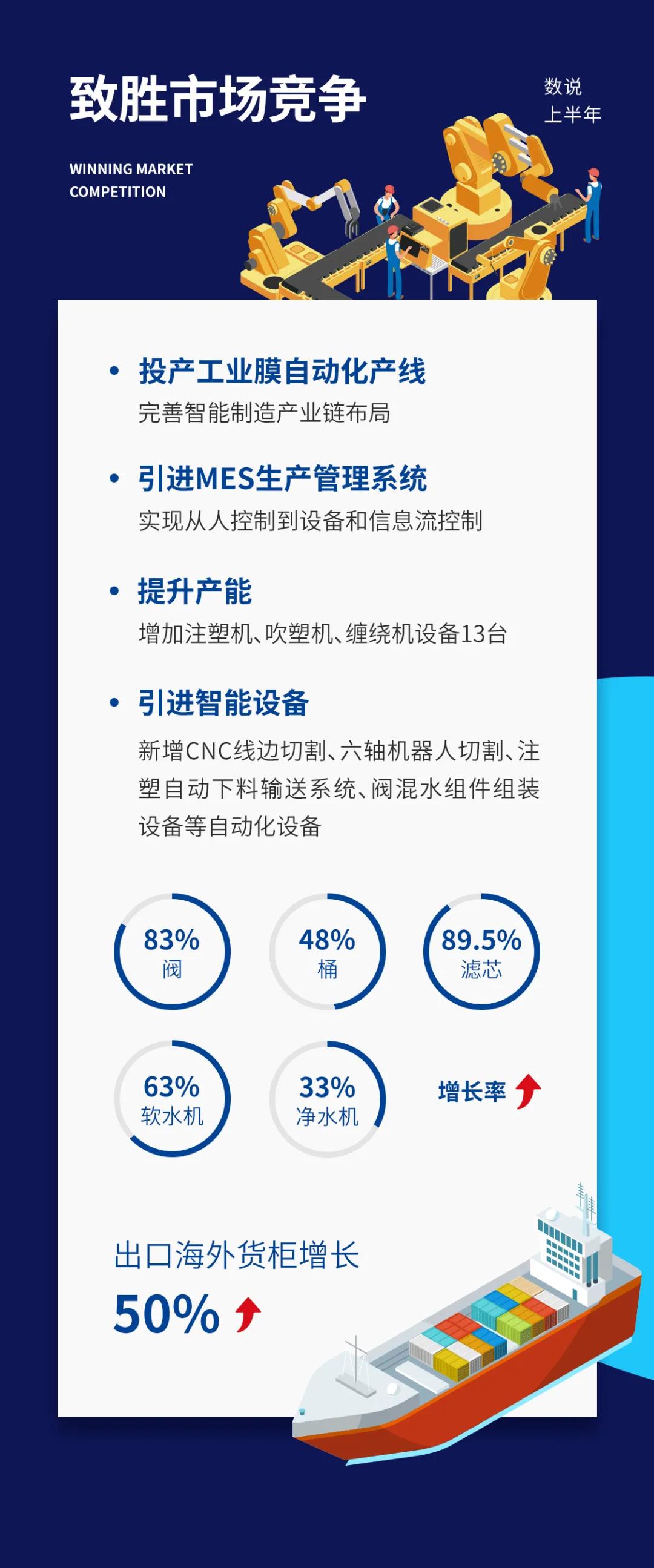 核心競爭力是指企業區別于其他企業而具有本企業特性的相對競爭能力。開能健康早在2010年前就開始布局智能制造,現已擁有完整的復合材料壓力容器(玻璃鋼桶)全自動化制造、反滲透膜元件全自動化制造、多路控制閥核心組件全自動化制造等智能制造能力,配合先進的管理系統提升、前瞻的產品戰略研究,實現精益管理,提高運營能力。