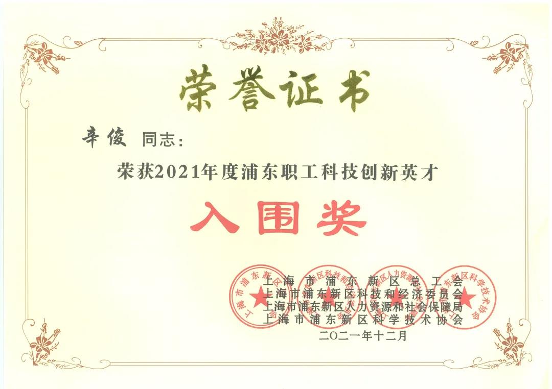 辛俊 榮獲2021年浦東職工科技創新英才入圍獎