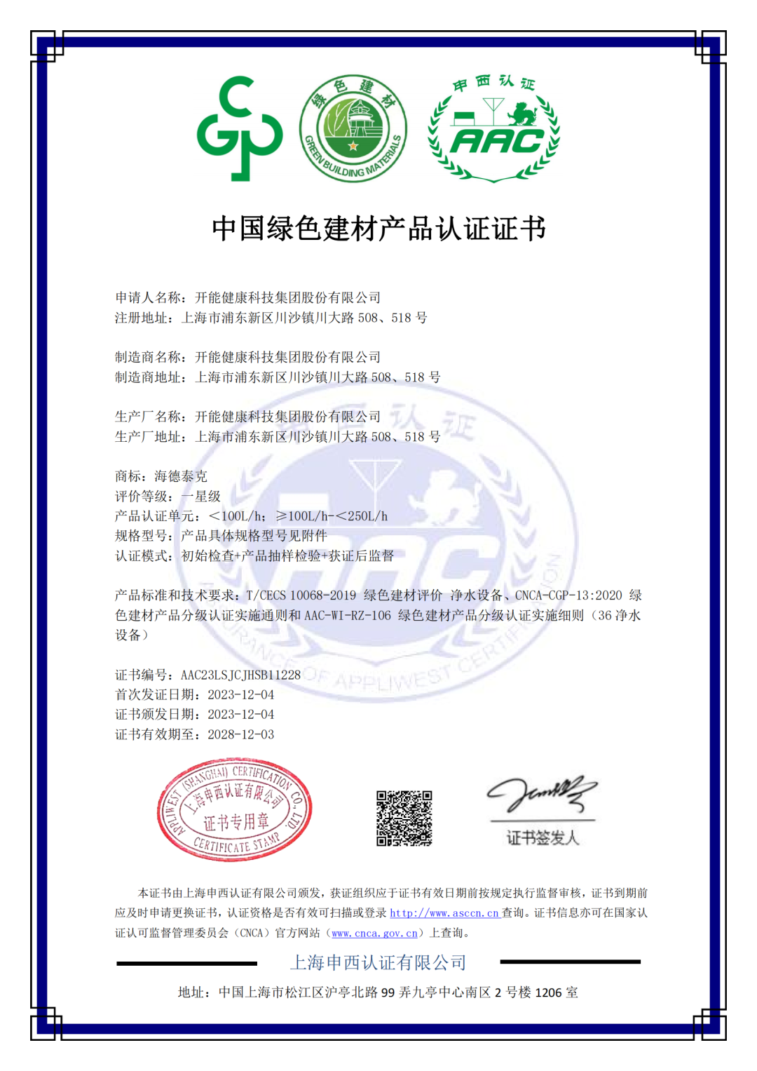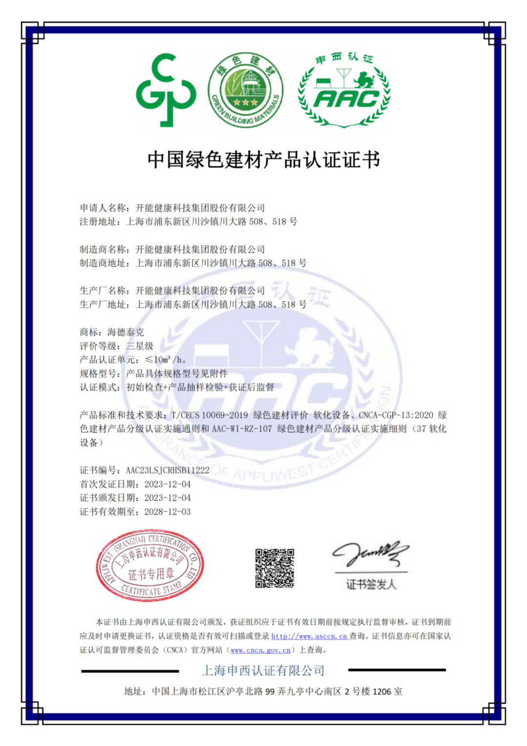 2024-02-19日前,開能健康科技集團股份有限公司(以下簡稱“開能健康”)生產(chǎn)的凈水機和軟水機產(chǎn)品成功獲得中國綠色建材產(chǎn)品認證,其中軟水機產(chǎn)品獲得三星級“中國綠色建材產(chǎn)品認證證書”,該級別是“中國綠色建材產(chǎn)品”分級認證中的最高等級。此次獲證,標志著開能在綠色低碳發(fā)展理念及成果得到了國家相關部門的充分肯定和認可。
