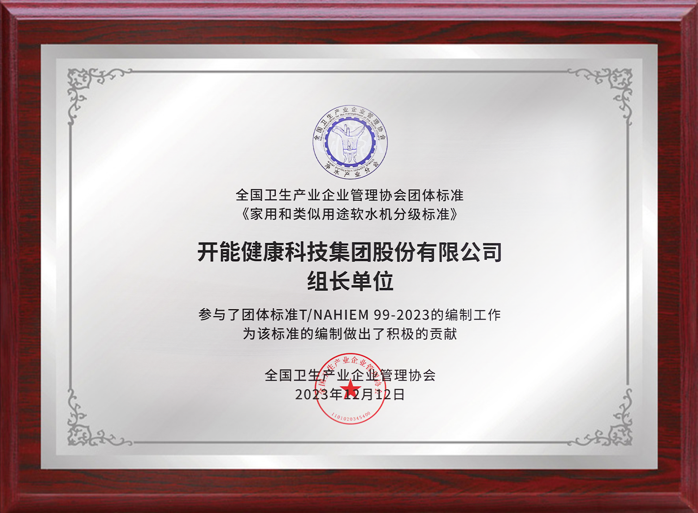 作為全屋凈水的先行者,開能集團始終專注于水處理產品的研發與制造,為了進一步規范凈水機產品質量水平、引導行業技術創新,開能集團參與全國衛生產業企業管理協會團體標準起草工作組,并擔任《家用和類似用途軟水機分級標準》組長單位,為規范凈水行業發展積極貢獻自己的力量。